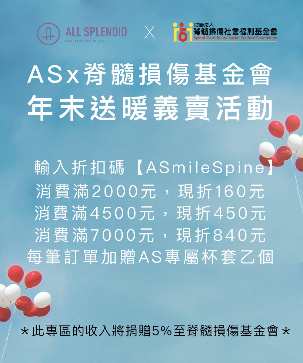 ・只要購買「AS X脊髓損傷基金會。年末送暖義賣活動」裡的商品,AS會將專區收入的 5% 捐贈給脊隨損傷基金會。